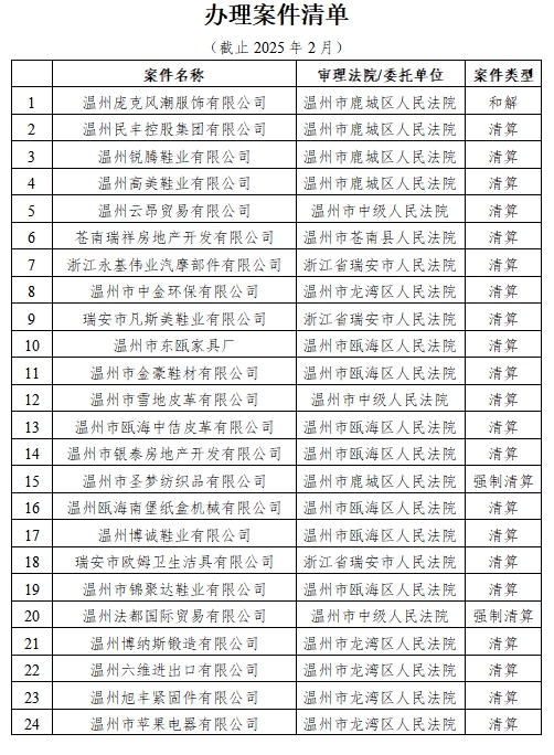 自2017年11月進入人民法院破產管理人名冊以來,已被溫州市中級人民法院、溫州市鹿城區人民法院、甌海區人民法院、龍灣區人民法院、瑞安市人民法院、樂清市人民法院、龍港市人民法院、永嘉縣人民法院、平陽縣人民法院、蒼南縣人民法院、安徽省蕪湖市中級人民法院、蕪湖市鳩江區人民法院、蕪湖市灣沚區人民法院、蕪湖經開區人民法院、無為市人民法院、南陵縣人民法院等多家法院指定擔任210余家企業破產管理人/清算組,涉及企業類型涵蓋金融投資、房地產開發、建設工程、機械制造、環??萍?、進出口貿易等領域,涉及服裝、鞋帽、汽配、眼鏡、紡織、印刷、光伏、建材等多個行業。管理債權規模近300億元,依法處置(含待處置)破產財產市值近100億元。