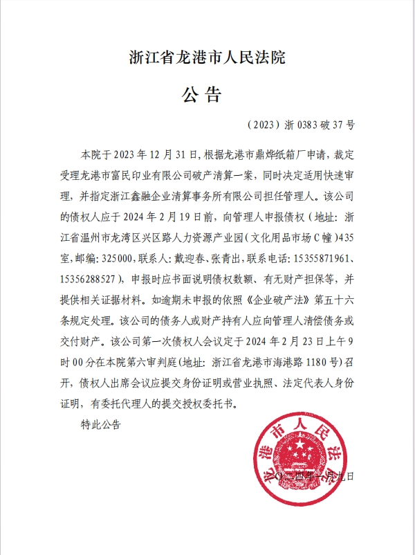 龍港市富民印業有限公司破產清算公告