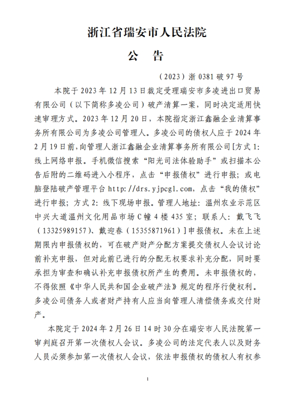 瑞安市多凌進出口貿易 有限公司破產清算公告
