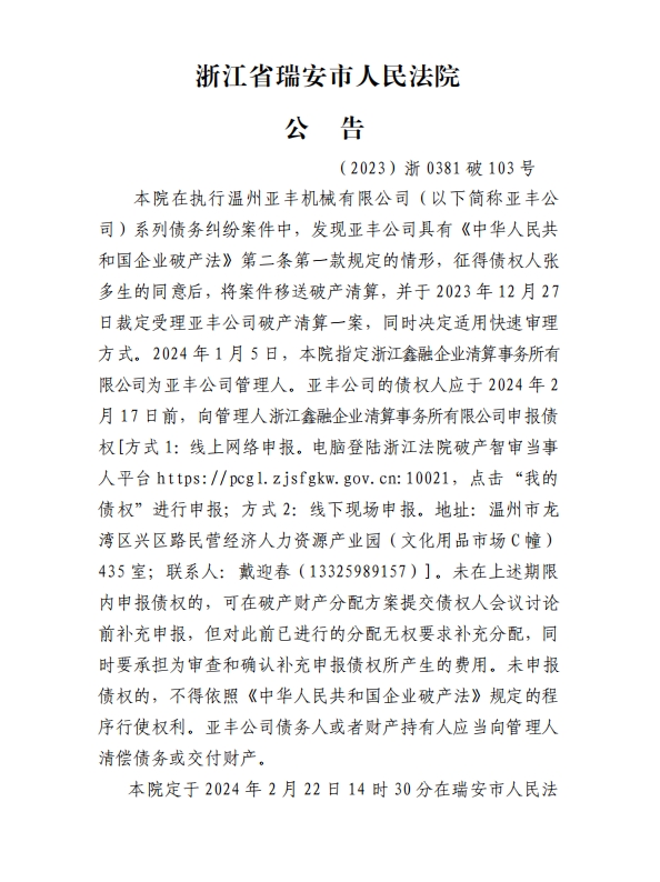 行溫州亞豐機械有限公司破產清算公告